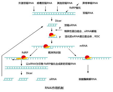RNAi 是 真核生物 中一种普遍存在且非常保守的机制 , 是一个天然的抗病毒机制。 RNAi 的作用机制可简述为“双链 RNA 降解 mRNA 从而阻断特定蛋白质的合成”,具体过程如下图: