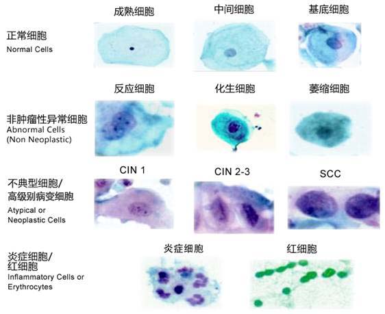 脱落细胞中包括基底细胞、中间细胞和成熟鳞状上皮细胞。基底细胞到成熟上皮细胞的形状是由椭圆形到多边形,细胞核由大到小,细胞质由少到多。