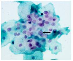 A:单个正常鳞状上皮;B:成团鳞状上皮细胞(多于5个细胞);C:子宫颈管上皮细胞(箭头所示)