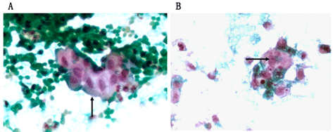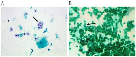A:CIN1细胞;B:CIN2-3和SCC细胞(箭头所示)